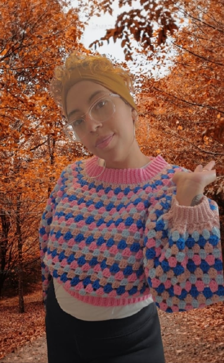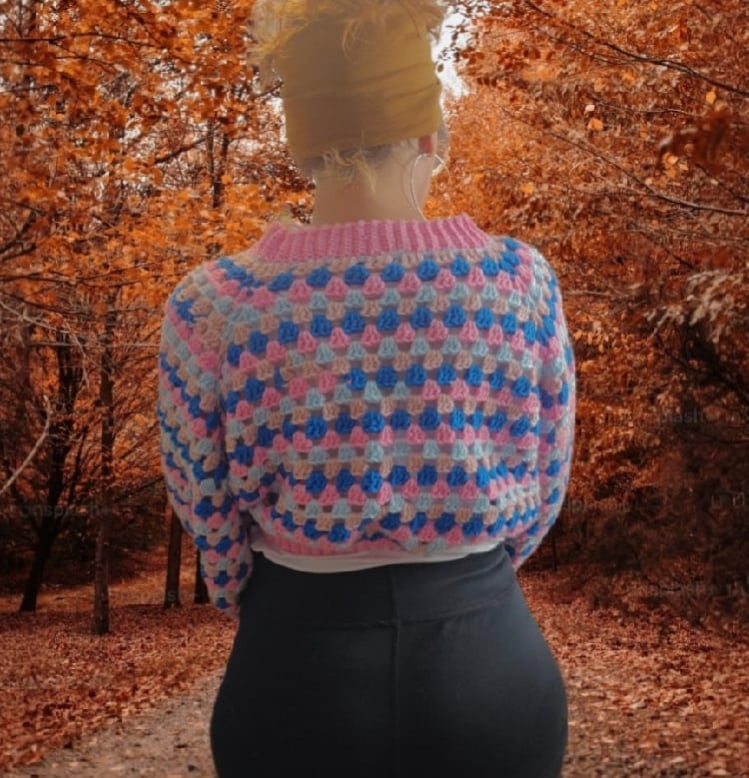 Handmade cropped granny sweater in size M/L. Bright, cozy, and stylish with a classic granny square design—perfect for layering or wearing on its own.