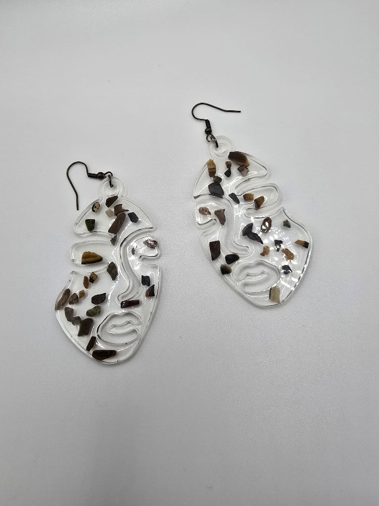 Handmade resin earrings with abstract face designs, filled with genuine Tiger’s Eye crystal chips. Known as the stone of courage and clarity, Tiger’s Eye is believed to boost confidence, focus, and protection — making these earrings both stylish and empowering.